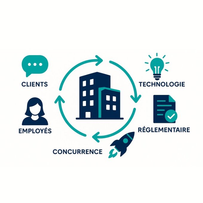 (clients, technologie, réglementaire, concurrence, collaborateurs…)